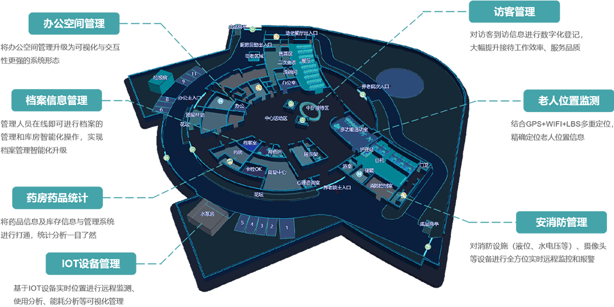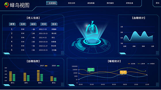 蜂鸟视图以自主研发的空间可视化引擎及室内定位技术为依托,为老人健康、防护、社交和生活提供社区养老、居家养老、机构养老、民政监管、智慧康养结合的智慧养老系统,满足政府养老民生的管理需要,打造“互联网+养老”新生态。