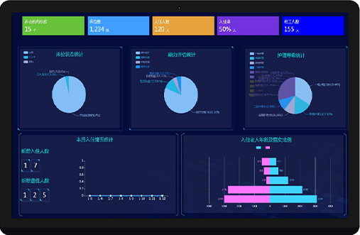 通过中央监控大屏实现对多种养老数据的综合展示,实时上传最新数据,有效降低运营成本,提升护理水平,提高管理水平,为养老院创造良好的社会效益和经济效益。